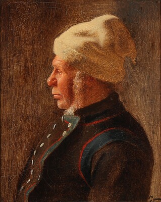 | Profile portrait of an Amager farmer wearing a woolly hat | |