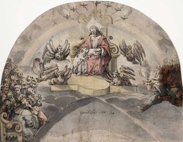 | Die Offenbarung der Majestät Gottes. Christus auf dem von vier geflügelten Tieren umgebenen Thron, an den Seiten die gekrönten Ä | |