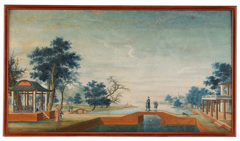 | Kinesiserande landskapsutsikter med figurstaffage - 1 par dörröverstycken | |