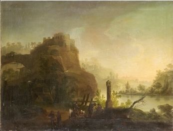 Flodlandskap med ruiner och figurer