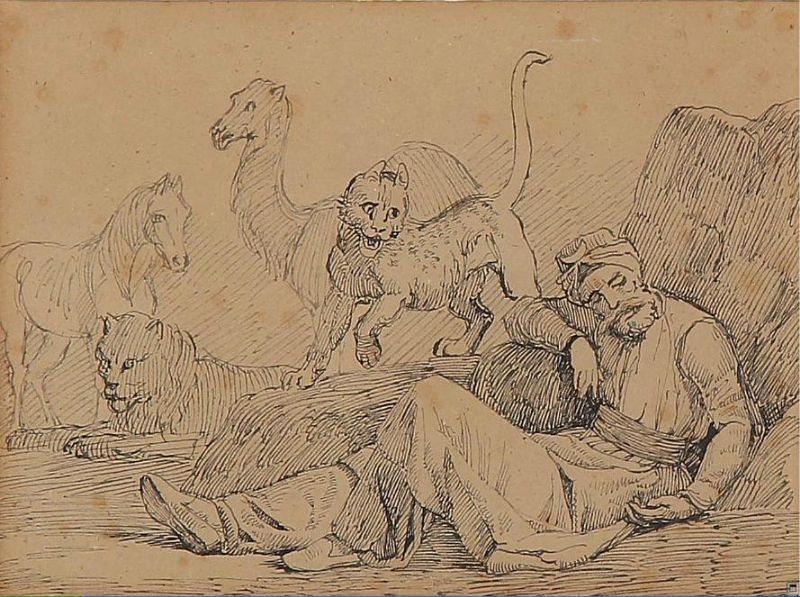 | Sleeping oriental gentleman surrounded by animals | |