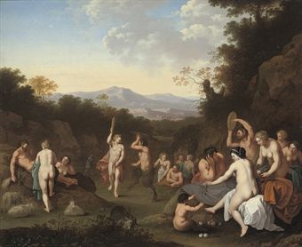 | A bacchanal with nymphs and satyrs dancing and making music in a wooded landscape | |