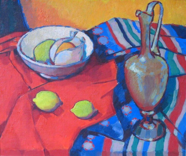 Stilleven op rode doek.