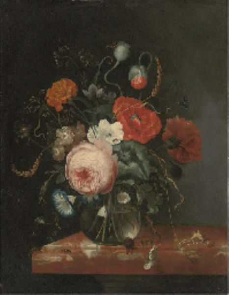 | A rose, a peony, a carnation, convolvulus and other flowers in a glass vase on a marble ledge, with seashells and insects | |