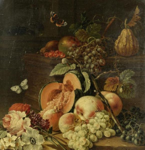 | A melon, peaches and grapes on a stone ledge with snails; and A split melon, peaches, grapes and various flowers on a stone ledg | |