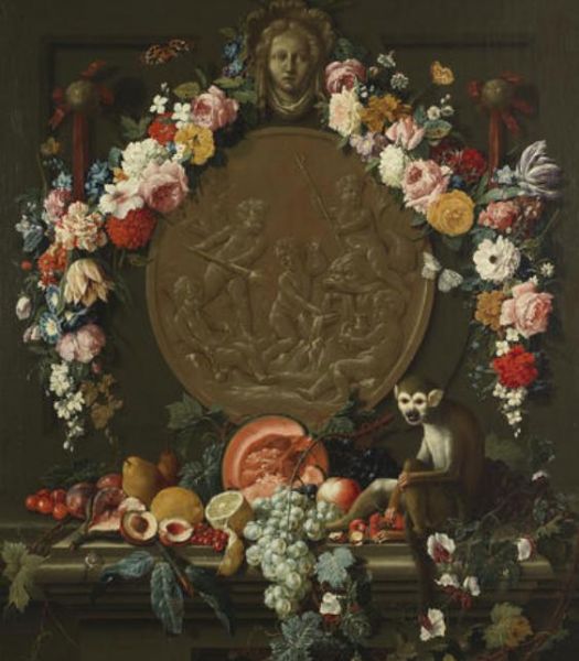 | A squirrel on a stone ledge with a still life of fruit, before a medallion garlanded with flowers; | |