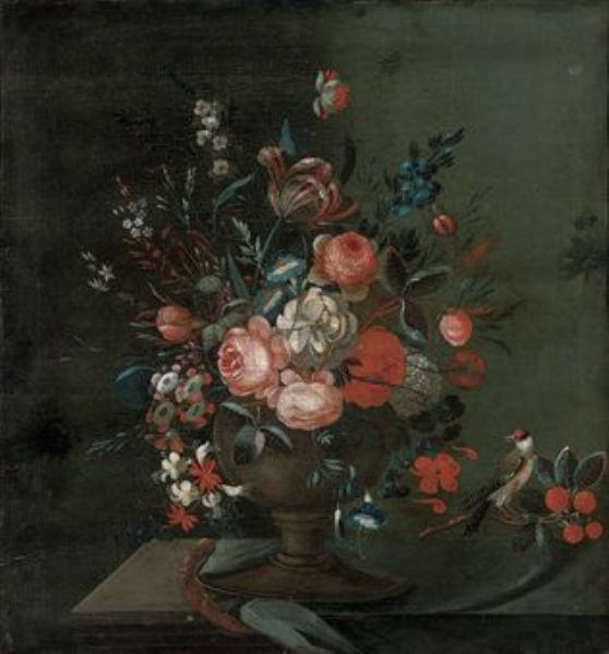 | Roses, chrysanthemums, convolvulus, a parrot tulip and other flowers in an urn, on a partially draped stone ledge with a goldfin | |