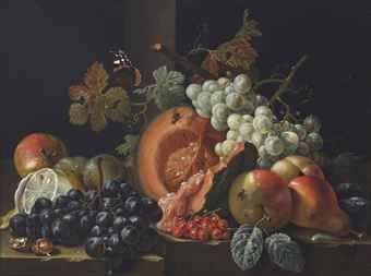 | Grapes, lemons, pears, a melon and other fruit on a stone ledge, with a caterpillar, a fly and a butterfly | |