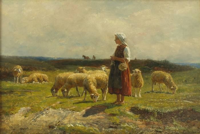 Barfüssige junge Bäuerin mit kleiner Schafherde