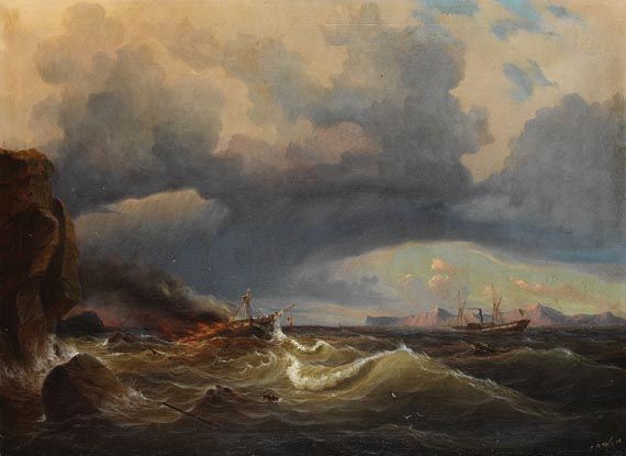 Schiffbruch an felsiger Küste, ein Raddampfer liegt in der Nähe