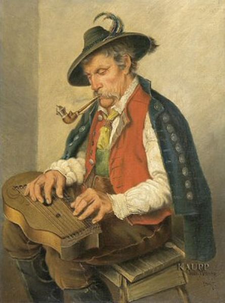 | Auf einem Schemel sitzender, Pfeife rauchender Herr in süddeutscher Tracht mit federgeschmücktem Hut, Zither spielend | |