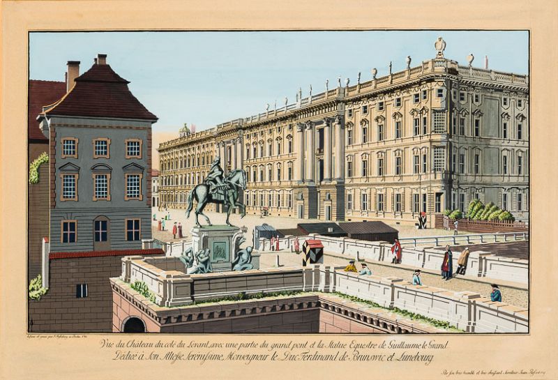 | Vue du Chateau du Coté du levant avec un partie du Grand Ponte et la statue Equestre de Guillaume le Grande | |