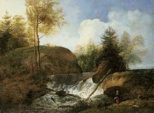 LANDSCHAFT MIT WASSERFALL, HIRTIN UND HERDE