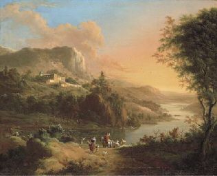 | An extensive river landscape with peasants and horsemen on a path, a walled palace beyond | |