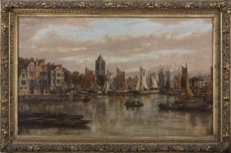 EUROPEAN CITY VIEW WITH BUSTLING HARBOR