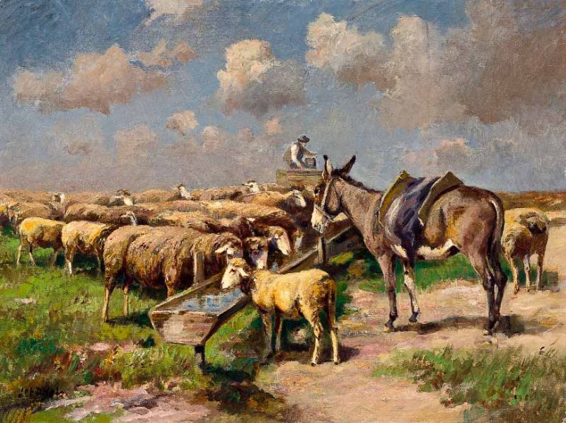 Esel und Schafherde an der Tränke.