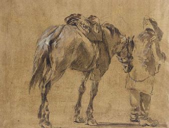 Un homme de dos menant un cheval sellé