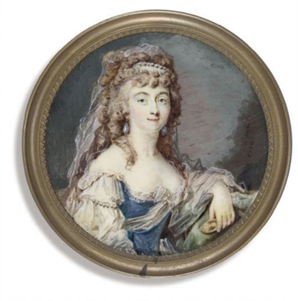 | A young lady, holding a portrait miniature of a gentleman in her left hand | |