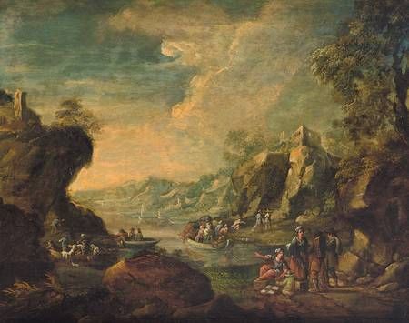 | Flusslandschaft mit Kauffahrteiszenen, übersetzenden Booten und Burghügeln. | |