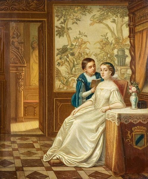 | Page, einem adeligen Fräulein vorlesend. In Interieur mit Gobelinbespannung | |