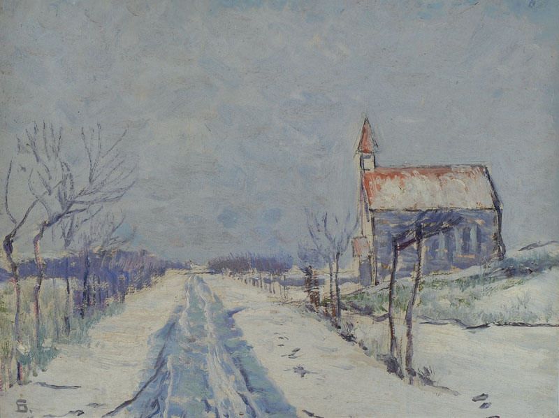 Verschneite Winterlandschaft mit Allee und Kapelle