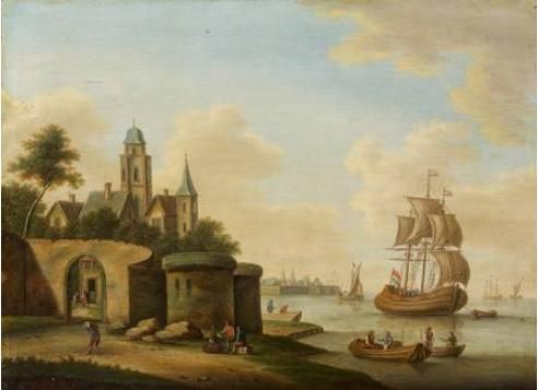 | Seestück mit einer Kogge unter Segeln, holländisch beflaggt. Feine stimmungsvolle Schilderung. | |