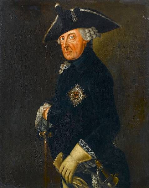 | Portrait of Frederick II of Prussia, three-quarter-length, in military uniform with a tricorn hat and the badge of the Prussian | |