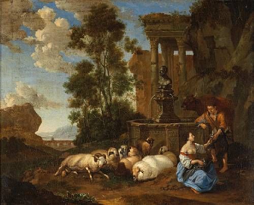 | Two figures at a fountain with their flock beside them and ruins beyond | |