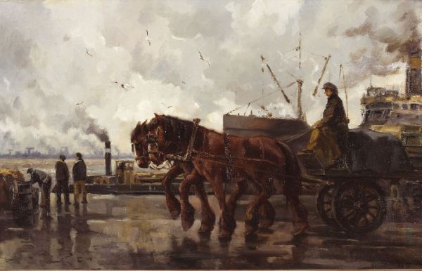 Figuren en paardenwagen op havenkade