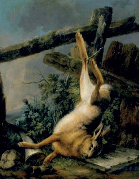 Jagdstillleben mit Hasen an Lattenzaun