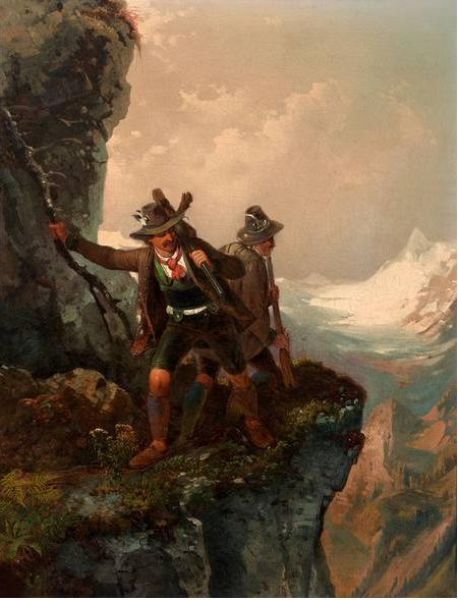 | Zwei Tiroler Jäger nach erfolgreicher Jagd auf einem Felsvorsprung. Weiter Blick in das Tal. | |