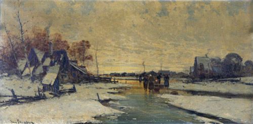 | Holländische Winterlandschaft mit Bauernhäusern und Menschengruppe auf dem Eis | |
