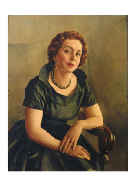 Portrait einer Dame im Taftkleid mit Perlenkette und Ohrschmuck