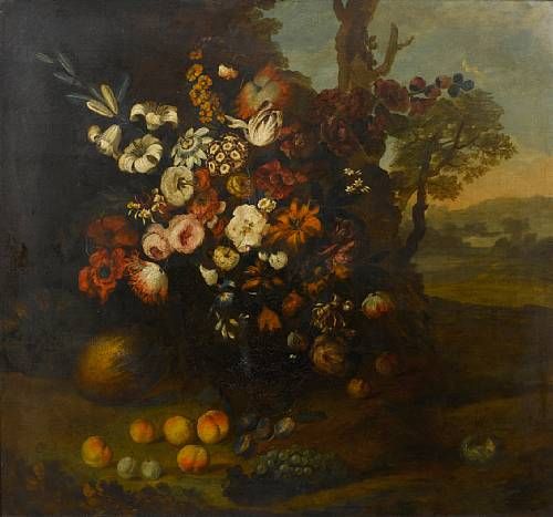 | Roses, peonies, tulips, white lilies in a glass vase with peaches, grapes, plums, a melon, a pumpkin and a bird's nest in a land | |