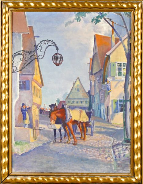 Romantisches Kleinstadtidyll mit Pferdekutsche vorm Gasthaus