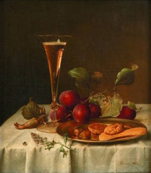 STILL LIFE WITH CHAMPAGNE FLUTE AND WILD PLUMS
