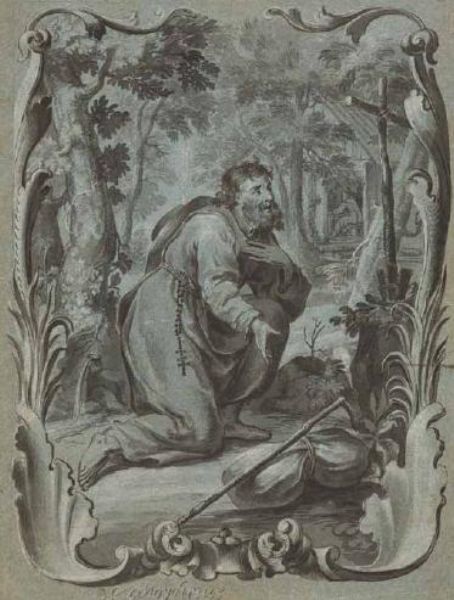 Der heilige Onuphrius in einer Rocaillearchitektur.