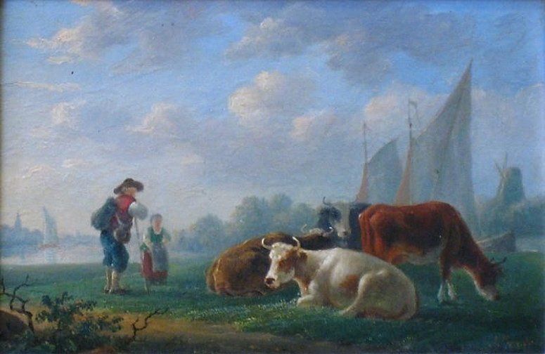 Rustende herders met vee en beurtschepen