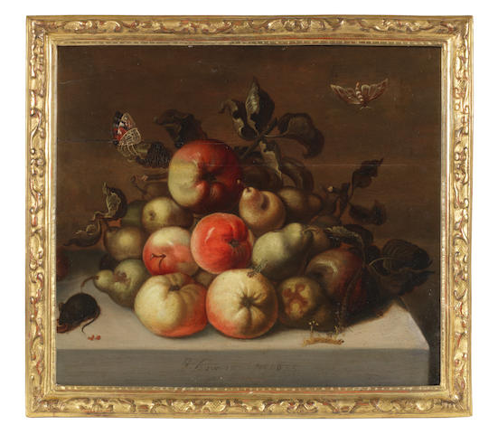 Quince and pears together with a mouse and butterflies on a stone ledge