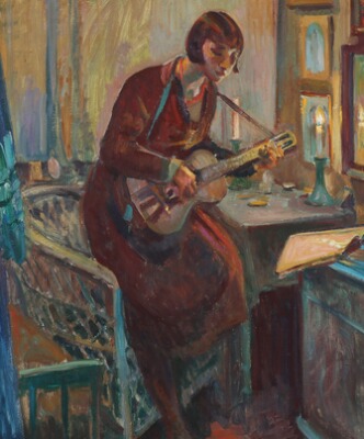 A woman playing guitar