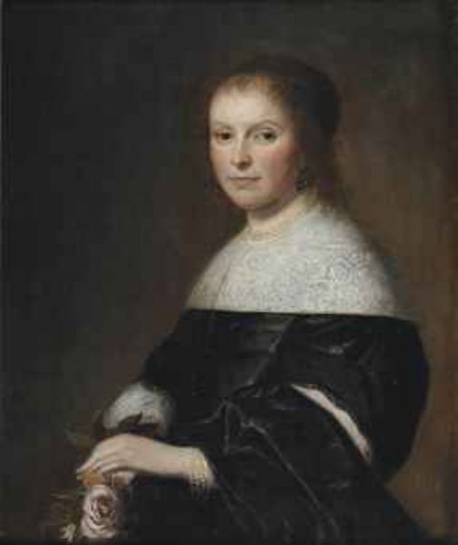 | Portrait of a lady, half-length, in a black dress with a white lace collar and pearl jewelry, holding a pink rose | |