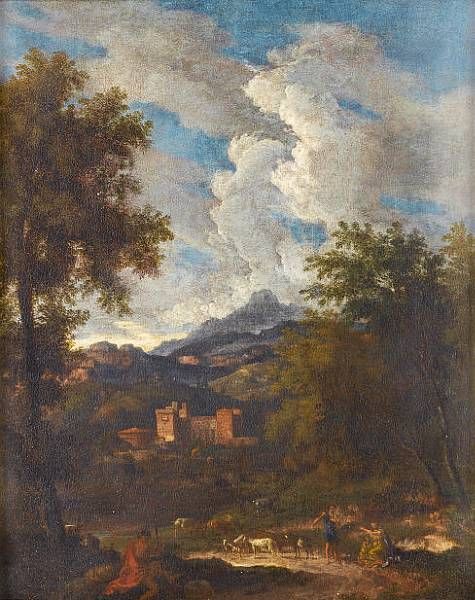 | A classical landscape with a goatherd and travellers on a track, a monastery beyond | |