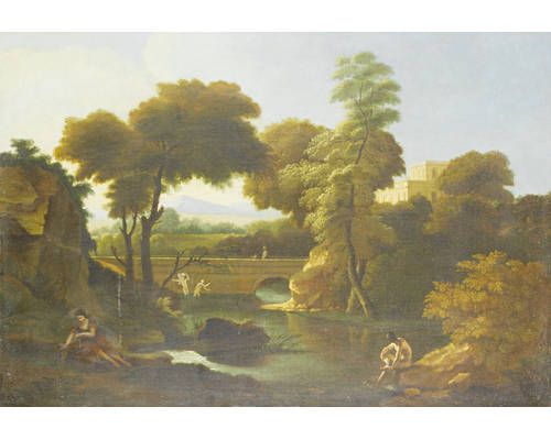 | Figures bathing in a river before an Italianate landscape, with a bridge in the distance | |
