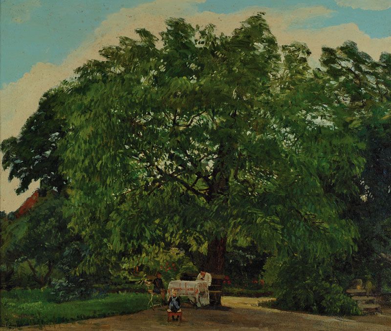 Studium an der Akademie Berlin bei Eugen Bracht, hier: Familienidyll unterm Kirschbaum,