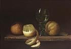 A STILL LIFE WITH A ROEMER, TWO ORANGES AND A LEMON ON A LEDGE