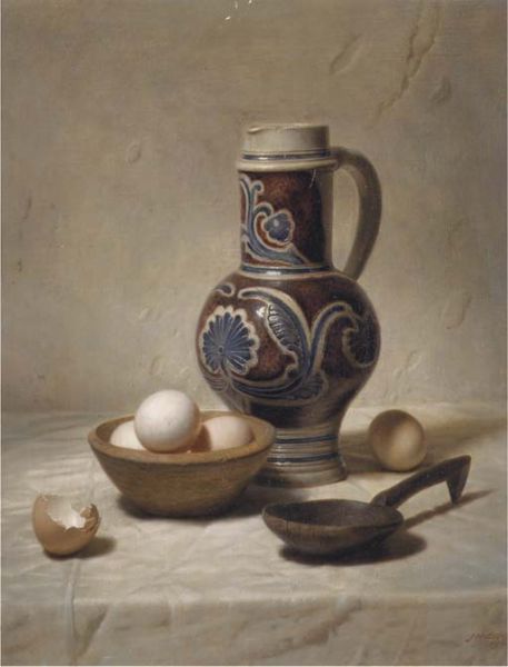 | A still life with jug, eggs in a bowl and a wooden spoon | |