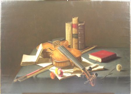STILL LIFE WITH A VIOLIN, BOOKS AND THREE FLOWERS