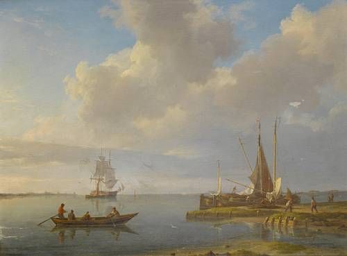 | Unloading barges on the banks of the Scheldt, with a trading brig anchored in the river and the spires and towers of Antwerp bey | |
