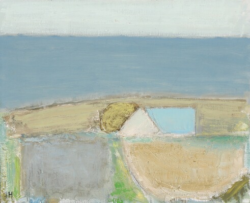 Landskab med hus og hav