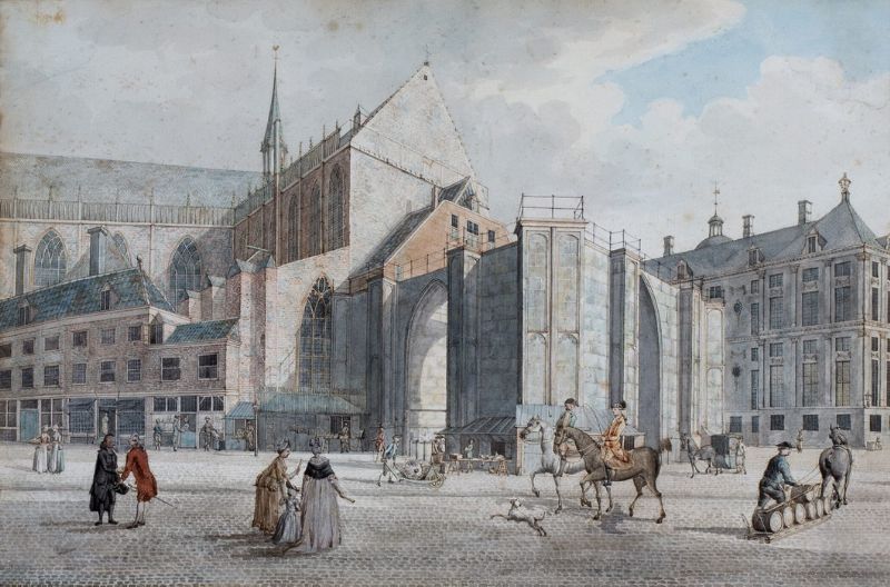 | De Nieuwe Kerk met de onvolmaakte toren nevens het Stadhuis te Amsterdam | |